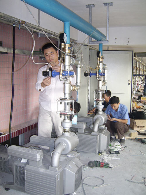 前期用的小型油式旋片真空泵,真空機老化,已經不便于維護了,后采用德國貝克大型干式真空泵,替代了多臺小型真空泵,采用干式真空泵,場地整潔, 省事,省電,省人力。